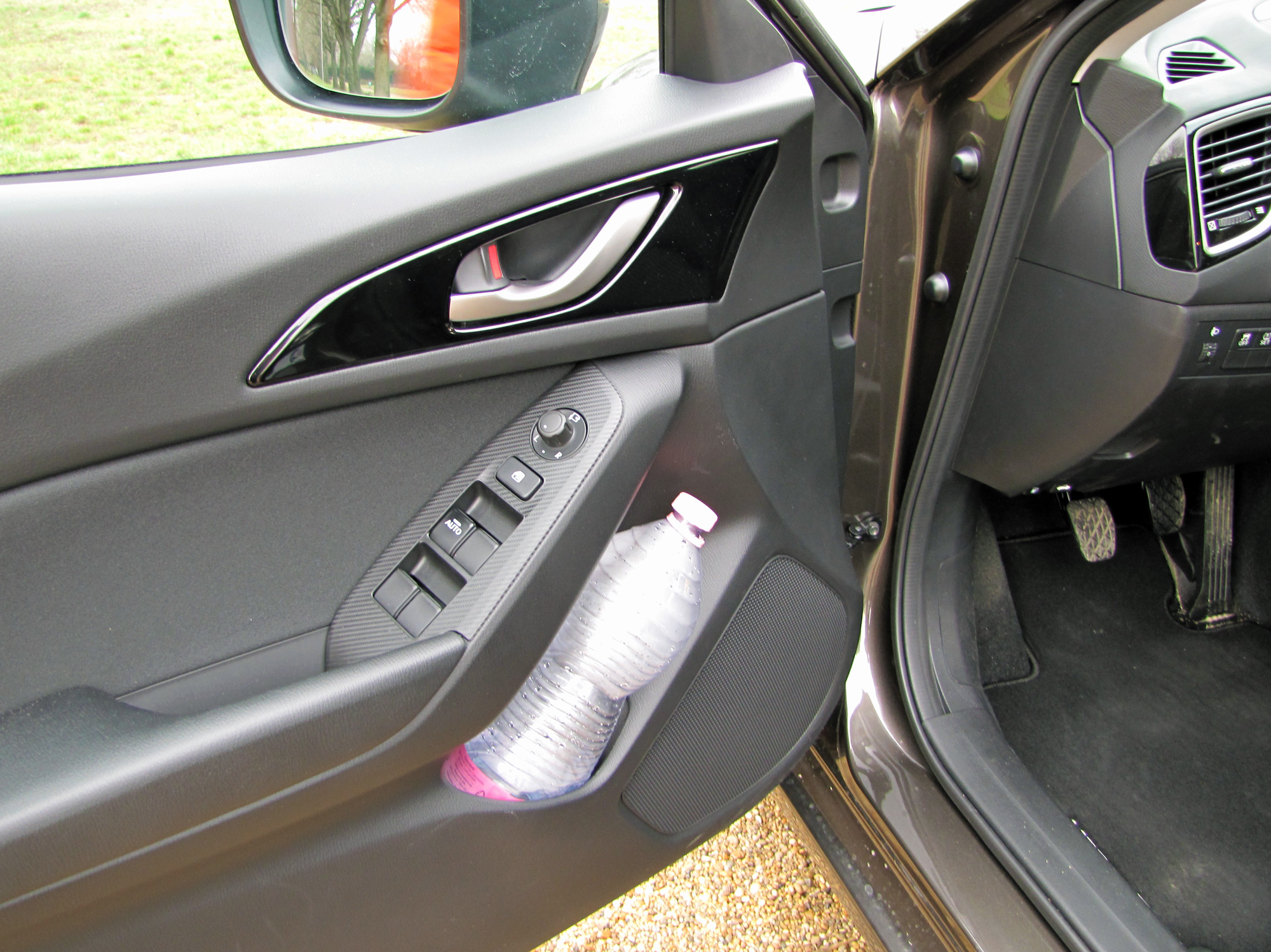 „Az autó kezelését illetően nagyon szeretem, hogy a fedélzeti számítógép menüje két irányban léptethető a kormánykerék gombjaival és egyszerre megjeleníthető a pontos idő, illetve az átlagfogyasztás értéke is. Hasonlóképpen szeretem, hogy a külső hőmérséklet és a digitális légkondicionáló beállítása is egyszerre látható. A régi 6-osban ezek megjelenítéséhez a középkonzol gombjaihoz kellett nyúlkálni. A műszerfal-világítás fényerőszabályzó gombja is sokkal jobban kézre áll. Így az új autómban lényegesen kevesebbszer kell elengednem a volánt, ami kényelmesebb és biztonságosabb. Sajnos tárolóhelyekben a régi 6-osom nagyvonalúbb volt, de azért már minden személyes holmimnak megtaláltam a helyét, belaktam az autót, egyedül az aprópénztartót sírom vissza az előző autómból. Cserébe az új 3-asban 1,5 literes ásványvizes palackok is elférnek az ajtózsebekben, így nem kell kisebb palackokkal vesződni, illetve a 1,5 literest nem az ülésen kell tartanom, ahonnan könnyen legurulhat. Ez a mindennapokban tényleg sokat számít. Lehet, hogy furcsán hangzik, de az új autómnak ezt a tulajdonságát valóban nagyon szeretem! Akárcsak a kulcs nélküli nyitást és indítást, a mindennapokban ez is egyszerűsíti az ember életét. Kár, hogy a csomagtartóba bedobott kabát zsebében már nem érzékeli a rendszer a kulcsot, ezért vagy a hátsó ülésre kell tennem a kabátomat vagy a nadrágzsebembe a kulcsot. De ennél nagyobb problémám soha se legyen!” – folytatta.