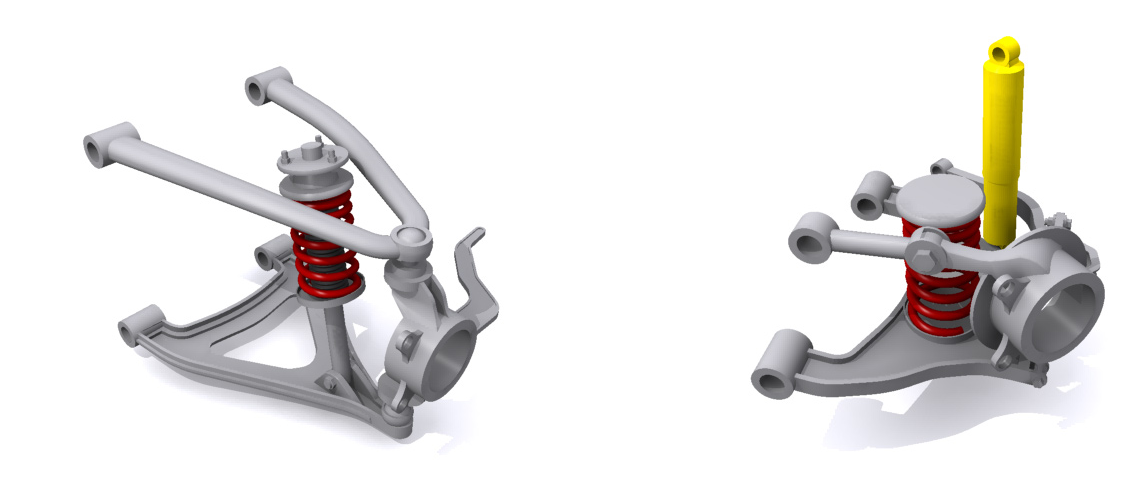 Hagyományos kettős keresztlengőkaros (bal oldali) és multi-link (jobb oldali) felfüggesztés