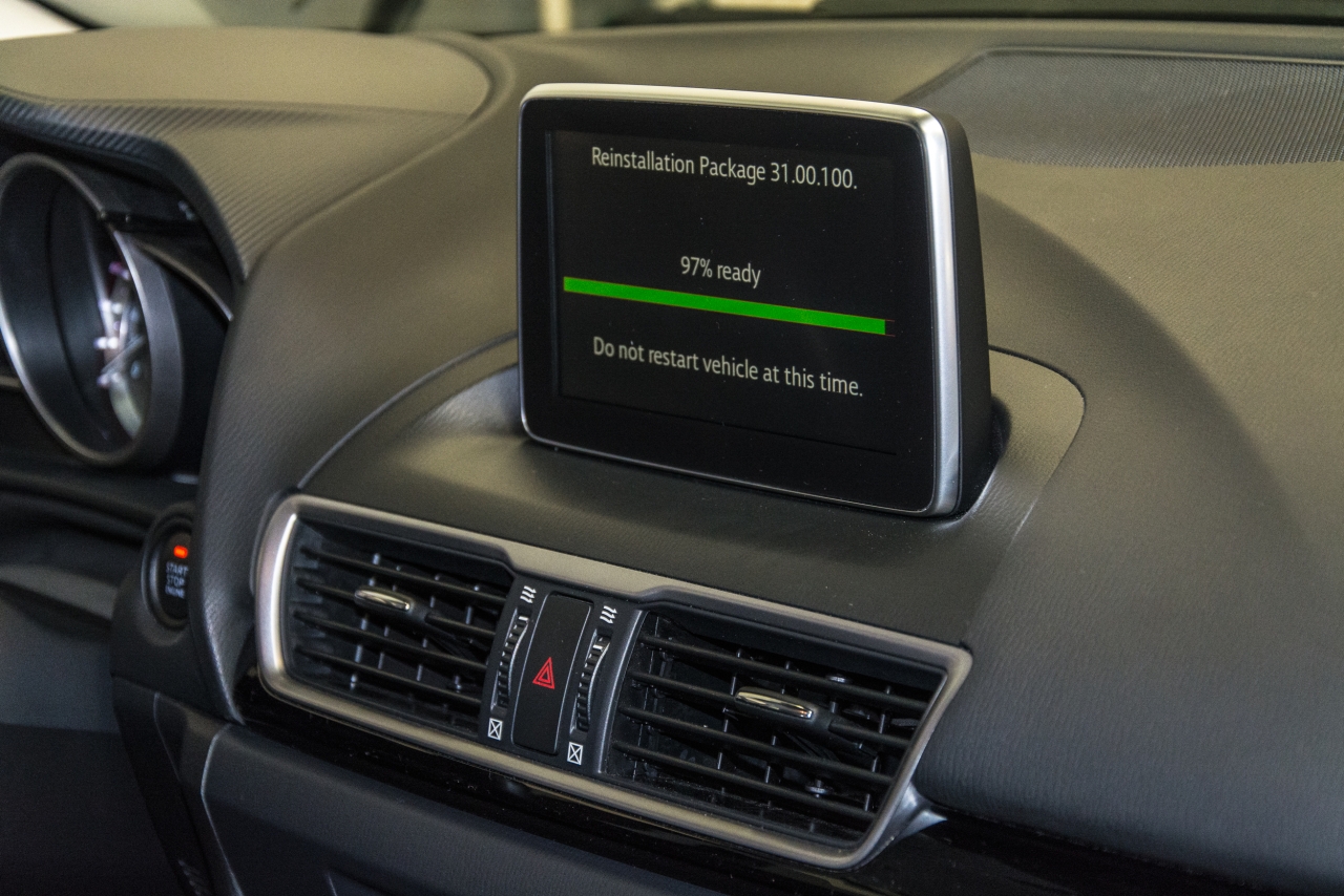 Miközben a szakember a mechanikai munkálatokat végezte, az utastérben is „folyt a munka”. A jármű fedélzeti rendszere is megkapta a legfrissebb szoftververziót. Erre azért volt szükség, mert a mérnökök folyamatosan fejlesztik a programot, ami nem csoda, hiszen például a beépített Bluetooth kihangosítót a frissen piacra kerülő mobiltelefonokkal is kompatibilissé kell tenni. Ráadásul, ha van integrált navigációs rendszer az autóban, annak szoftvere is ilyen módon frissül. Barátunk autójának esetében két verzióval frissebb program dolgozik most a hármasban, mint a látogatást megelőzően, bár őszintén szólva addig is és azóta is ugyanúgy teszi a dolgát. Igaz, időnként akadnak gondjai, mert régi Nokia készüléke néha lefagy, sőt a jármű rendszere is le tud bénulni ilyen esetben.