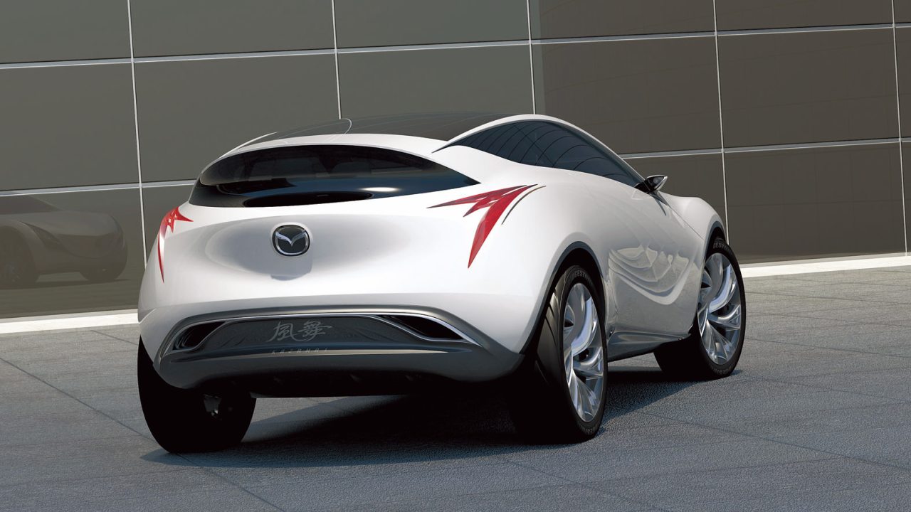 A korabeli sajtóanyag elmondása szerint a karosszéria ék alakja azt az érzést, látványt hivatott megtestesíteni, mint amikor egy nyílvessző átszáguld a szélviharon. Egyszerűen csak tör előre, megingathatatlanul ellenállva bármilyen erős fuvallatnak. Hasonlóképpen csupán az autó oldalán látszódik, hogy „lobogtatja” a szél. A viharon áttörő nyíl erejét az autó egésze közvetíti és az egyes részletei is erősítik. Már a 4520 milliméter hosszú, ám 1930 milliméterével meglehetősen széles, ugyanakkor SUV mivoltához képest mindössze 1,5 méter magasságú, tehát egész alacsony Kazamai kiállásáról sem éppen egy törékeny nádszál jut eszünkbe. Szinte csak azért mondható szabadidő-autónak ez a SUV, mert a kupés karosszériát hatalmas, 22 colos kerekeken álló „magaslatra” építették a Mazda mérnökei. Ráadásul a kerekeket a Kazamai minden sarkán hangsúlyos, erőtől duzzadó sárvédőívek fogják közre. Ezt a masszív hatást tovább erősítik a rövid túlnyúlások és a lapos tető is.