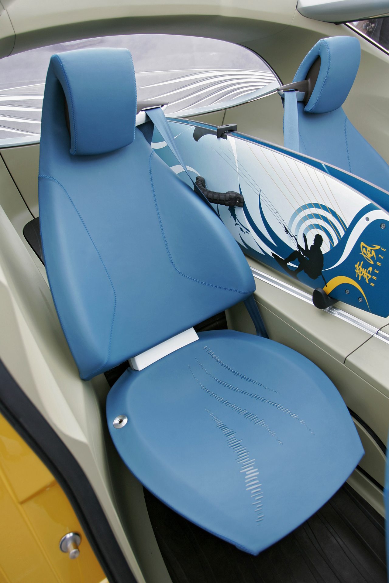 Az utastér barna padlója, kék ülései és türkizzöld színei természetesen a tengerpartot idézik. Az anyaghasználat szintén a természetesség érzetét erősíti. A padló például bőrbevonatot kapott, így a tengerparton mezítláb beülve is kellemes a tapintásuk. Az ülések szintén bőrbevonatúak, ám olyan hatást keltenek, mint a vízi sportokat űzők nedves ruhája. A kapcsolók víz- és homoktűrők, a középkonzol pedig a csomagtartó felől elérhető helyet biztosít a kite-deszkáknak. Az alaphelyzetben 400 literes poggyásztér padlója alatt külön rekesz található a nedves holmiknak.