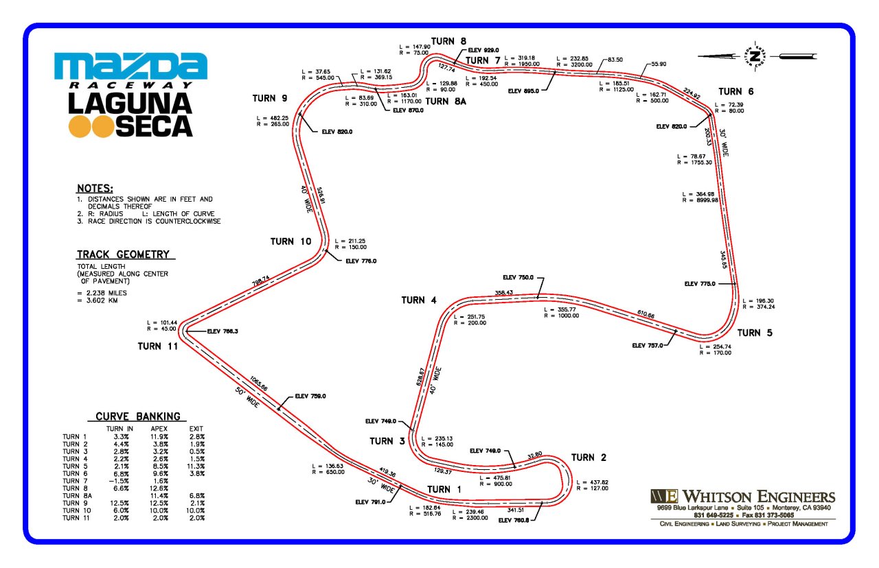 Az aszfaltcsík egyébként 3,6 kilométer hosszú (rövidebb, mint a Hungaroring), 11 kanyart tartalmaz és összesen 91 méter a szintkülönbsége. A kaliforniai Montereyben fekszik, másfél millió dollárból épült meg 1957-ben, hogy az államban oly népszerű autóversenyzést az utakról végre zárt pályára szoríthassák. Sokszor összetévesztik egyébként a mexikói Monterrey településsel, ahol szintén rendeztek autóversenyeket a Fundidora Parkban, szóval figyelni kell az -r betűk mennyiségét. A versenyek, veteránautó rendezvények és különböző rekreációs események mellett természetesen tesztpályaként is szolgálja a Mazdát, a lesifotósok nagy örömére többször is össze lehet futni álcázott vagy kevésbé álcázott prototípusokkal, miközben gyűjtik a kilométereket és a tapasztalatokat.