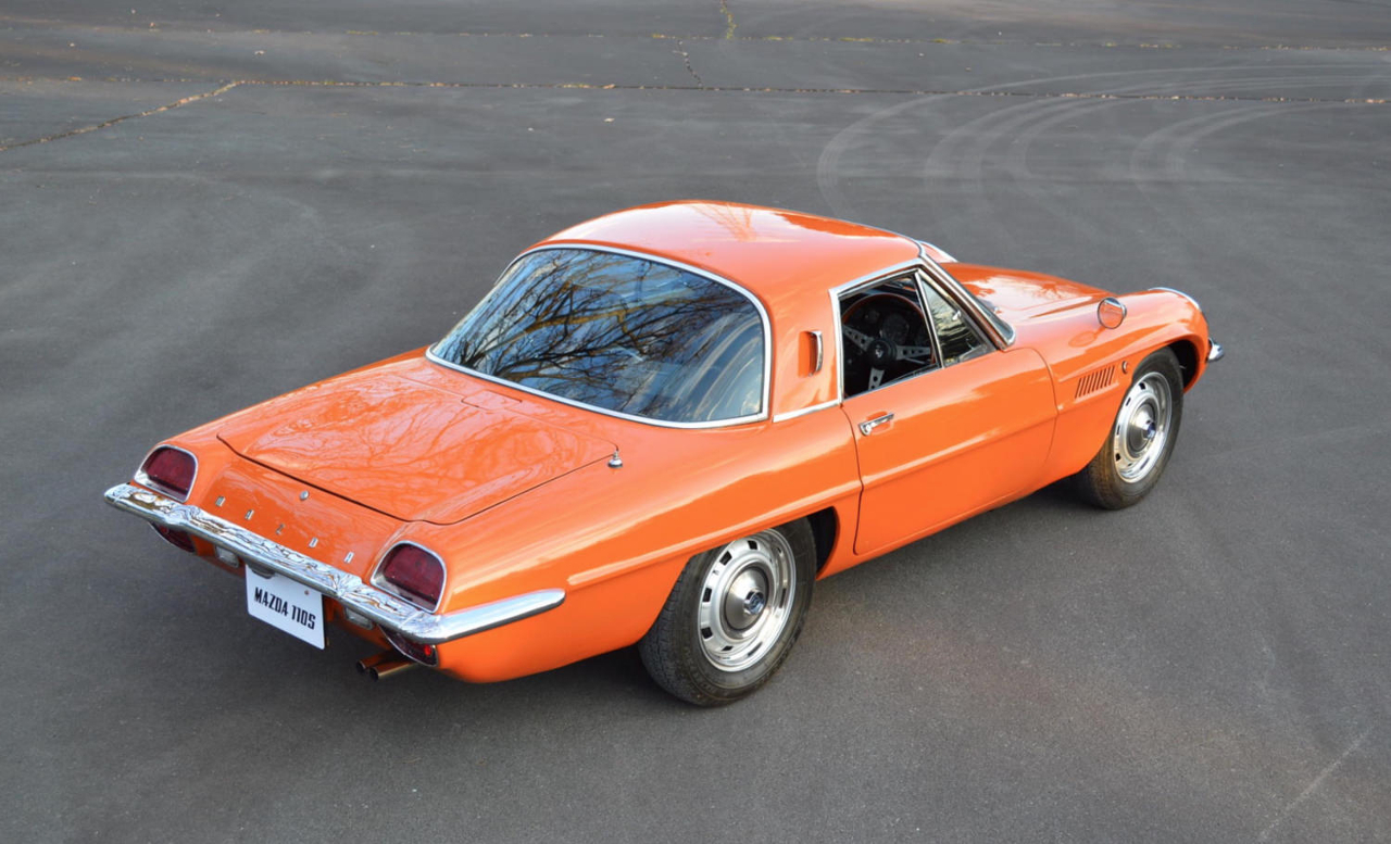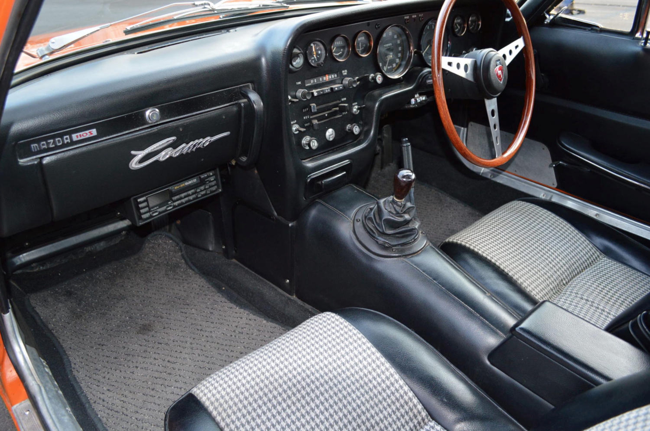 Korábban már ráakadtunk egy árverésen kínált Cosmóra, de a rangos Amelia Island árverésen most újra felbukkant egy narancs színbe öltöztetett, kitűnő állapotú Mazda 110S Cosmo Sport Coupe. A kalapács alá kerülő autó az exportra gyártott Cosmók közül került ki, amit az embléma melletti 110S feliratról lehet azonosítani. A szám természetesen ebben az esetben is a 110 lóerős teljesítményre utal, amit a kétrotoros, egyliteres kamratérfogatú, bolygódugattyús motor produkál.