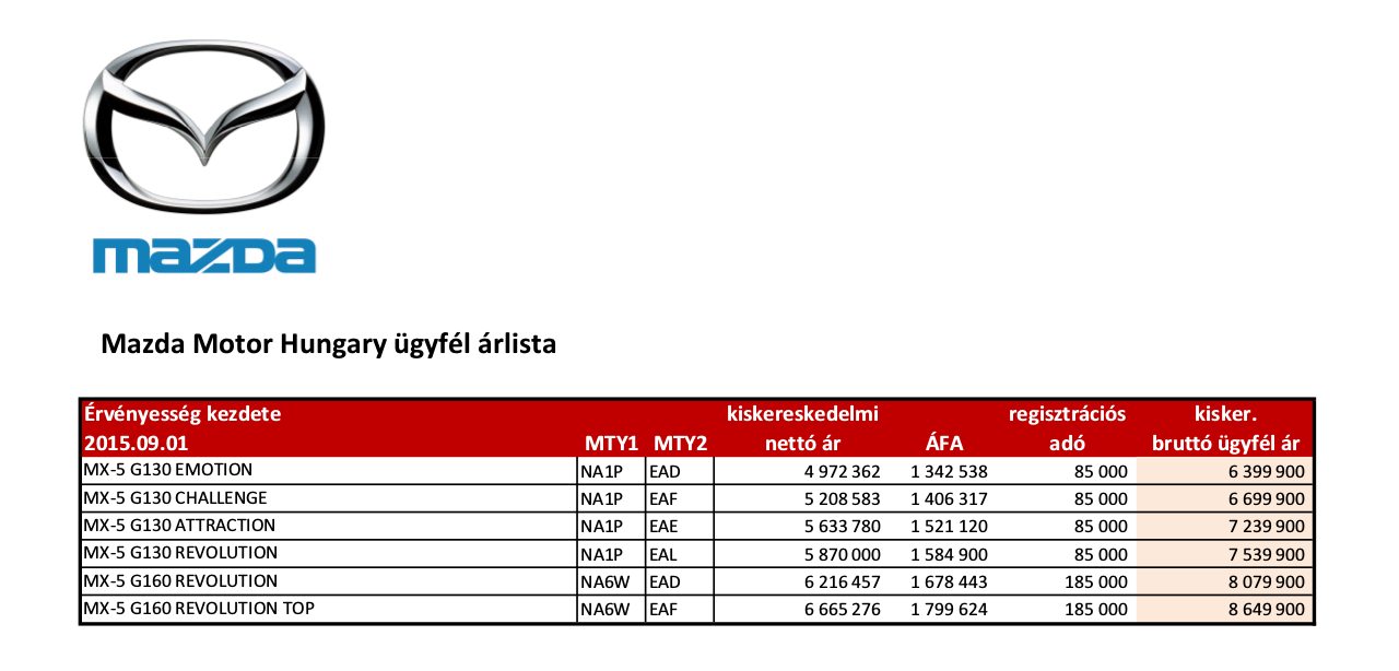 Sok mindent tudunk már az új MX-5-ről – illetve gyakorlatilag mindent – hiszen nem győzi hangoztatni a gyártó az újdonság kiválóságát, például jelentős tömegcsökkenését, aminek jóvoltából közel olyan könnyű, mint az első generáció. Valamint 50-50 százalékos tömegeloszlása sem éppen mindennapi, csakúgy mint az előzőekből nagyban következő, kiemelkedő vezetési élmény a viszonylag szerény menetteljesítmények ellenére is. Persze már azt is tudjuk, hogy nem csupán az élményhajhászáshoz, hanem a vetélytársverő köridőkhöz is elegendő ez a teljesítmény, akkor meg minek is több. Szóval éppen csak az MX-5 hazai árait nem ismertük még eddig, illetve nem éltük át személyesen, milyen élményt jelent vele falni a kilométereket. Reméljük, ez utóbbira sem kell már sokat várnunk, most viszont be kell érnünk annyival, hogy megismerhetjük az árakat és a felszereltségeket.