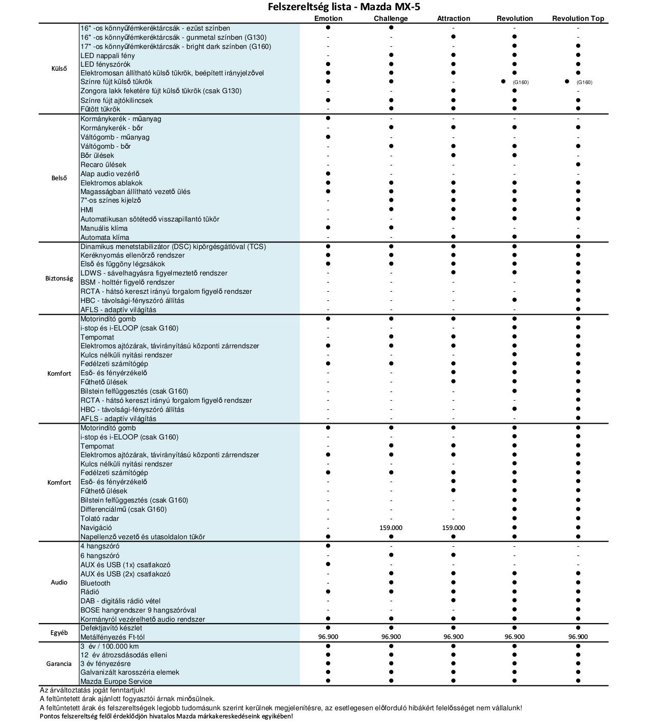 A REVOLUTION kivitel motortól független többletfelszereltsége az ATTRACTION-höz képest még az automatikus távolsági fényszóró asszisztens, a kulcs nélküli nyitási rendszer, a tolatóradar, a kilenc hangszórós Bose audiorendszer, valamint a navigációs rendszer. A csak a kétliteres motorral elérhető REVOLUTION TOP felszereltség mindehhez Recaro sportüléseket, holttérfigyelő és a hátsó keresztirányú forgalmat figyelő rendszert, valamint adaptív világítást tesz még hozzá, 570 ezer forintért. A csúcskivitel tehát 8649900 forintba kerül és ez az összeg legfeljebb még a bármelyik modellhez kérhető metálfényezés 96900 forintos felárával növelhető. Ezzel immár hazánkban is eljött hát a negyedik Mazda roadster ideje. Isten hozott új MX-5.