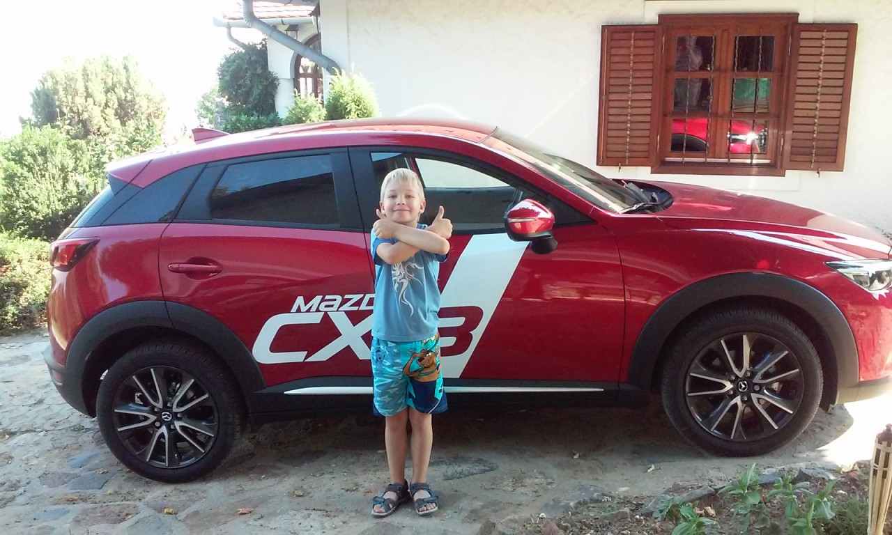 Nagyobbik fiammal  pénteken délután birtokba vehettük az autót és csak hétfőn délelőtt kellett visszaszolgáltatni, úgyhogy ez a nyereményhétvége igen bő hétvége volt. Ráadásképpen teletankolva és az egész országra érvényes autópálya-matricával kaptuk meg a CX-3-at. Országjáró útra készültünk, úgyhogy ennek igazán örültünk. Amíg a szalon előtt bemutatták nekünk az autót, addig odabent elkészült a használatbavételi engedélyem és már indulhattunk is.