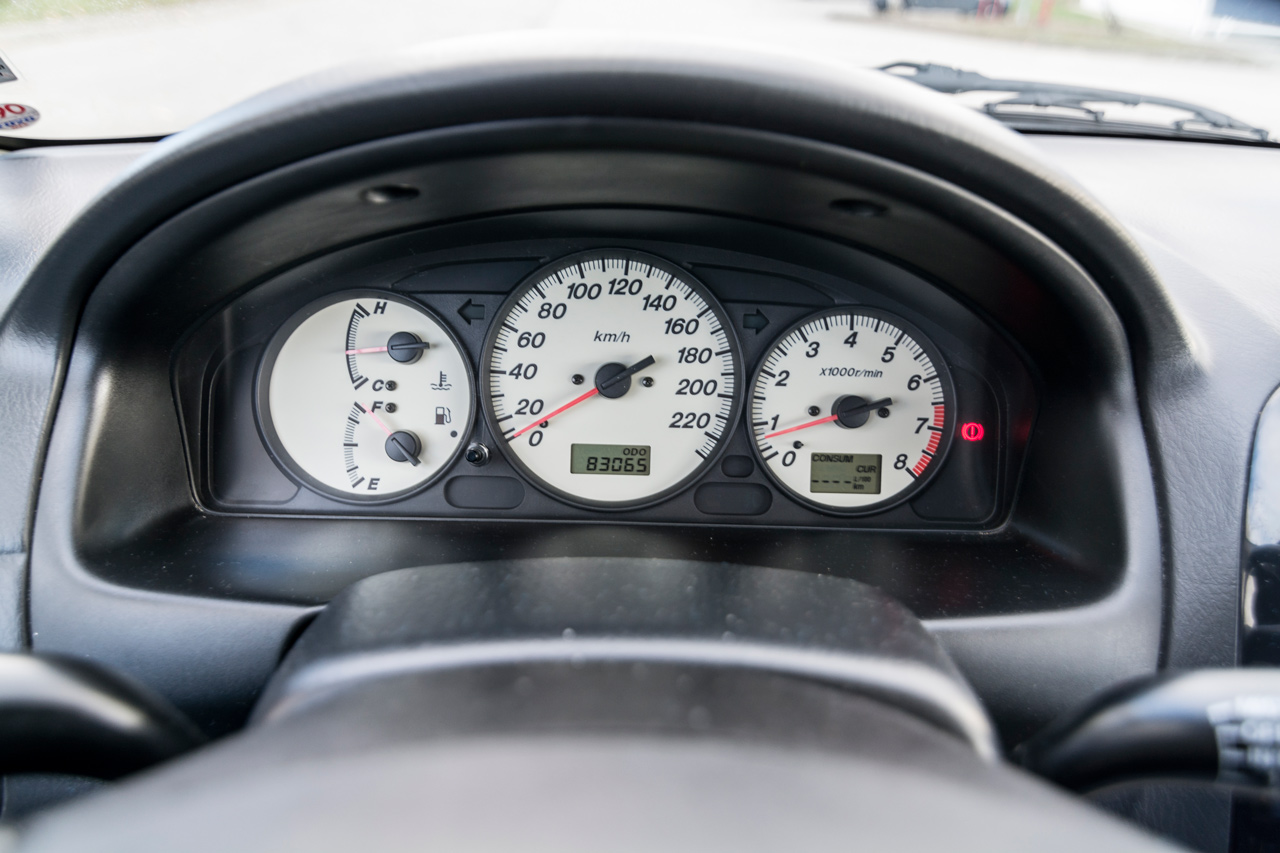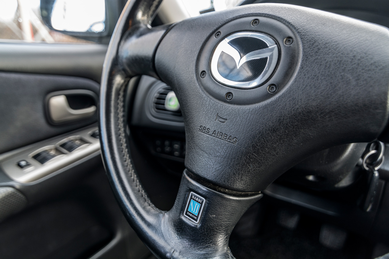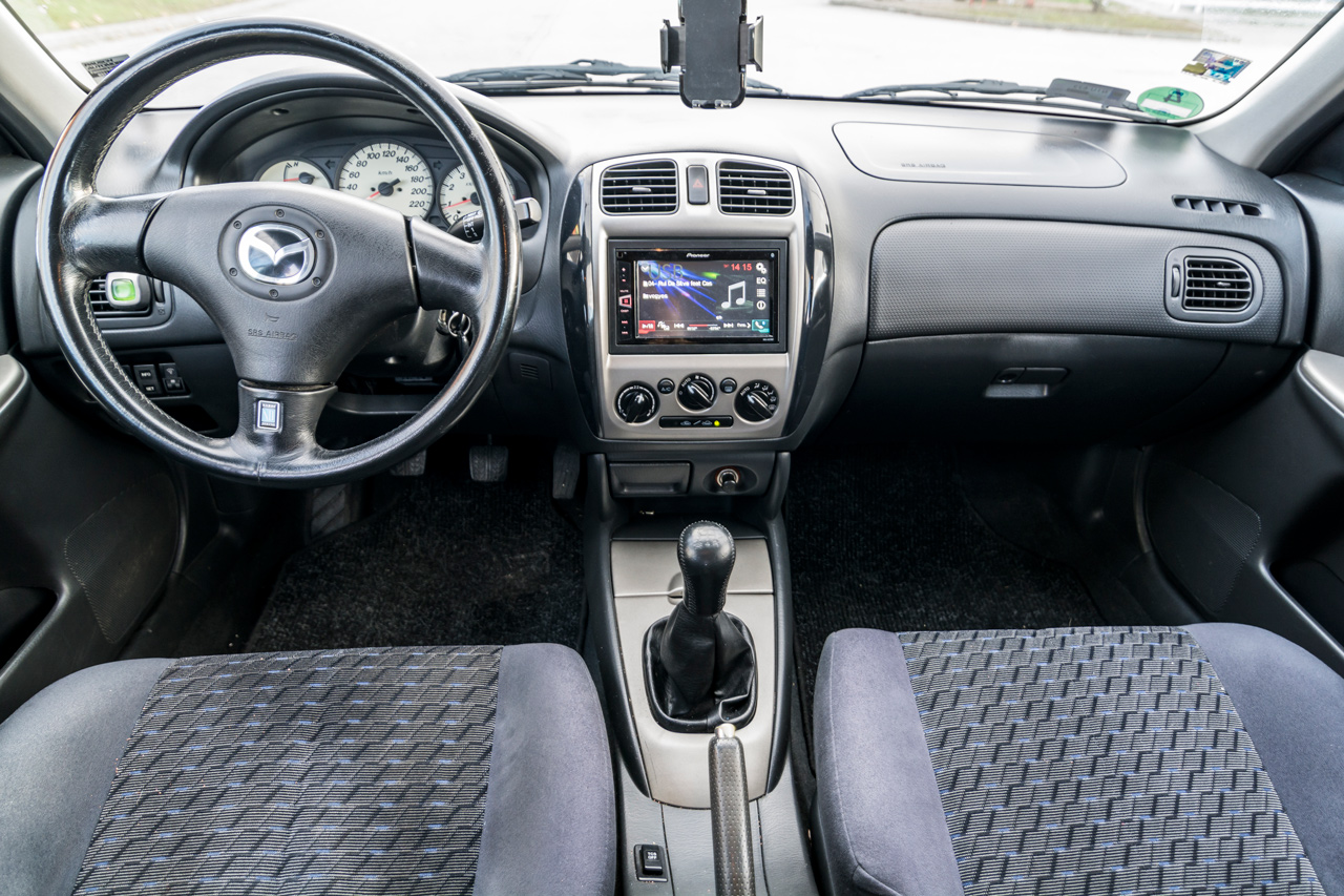Felszereltség tekintetében szinte minden lényeges kiegészítőt megtalálunk. A gyári 16 colos könnyűfém kerékgarnitúra mellett ízléses légterelők és két nagy méretű ködfényszórót tartalmazó lökhárító különbözteti meg kisebb testvéreitől. A motorházfedelet felnyitva szembe tűnik a gyári toronymerevítő, amely kanyargós utakon bizony érezteti jótékony hatását. A csúcsmodellhez illően a kényelmi extrák sora is igen hosszú. A négy légzsák, az ABS, ESP, kipörgésgátló mellett találunk még automatikus klímaberendezést, Nardi bőrkormányt, fedélzeti számítógépet, távirányítós központi zárat. Igazából egyedül a sebességrögzítő és mai szintnek megfelelő audiorendszer hiánya volt észrevehető. Utóbbi azóta már megoldódott, mert a gyárilag dupla Din szabványú helyre egy Pioneer-fejegység, az ajtókba pedig JVC hangszórók kerültek. Előbbi pedig még nincs elvetve, utólag ugyanis könnyen megoldható a bowdenes gázpedállal rendelkező Mazdába.