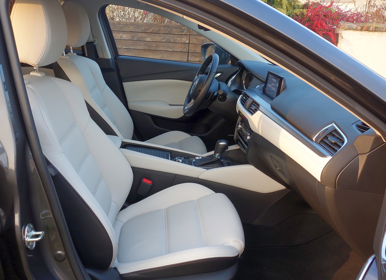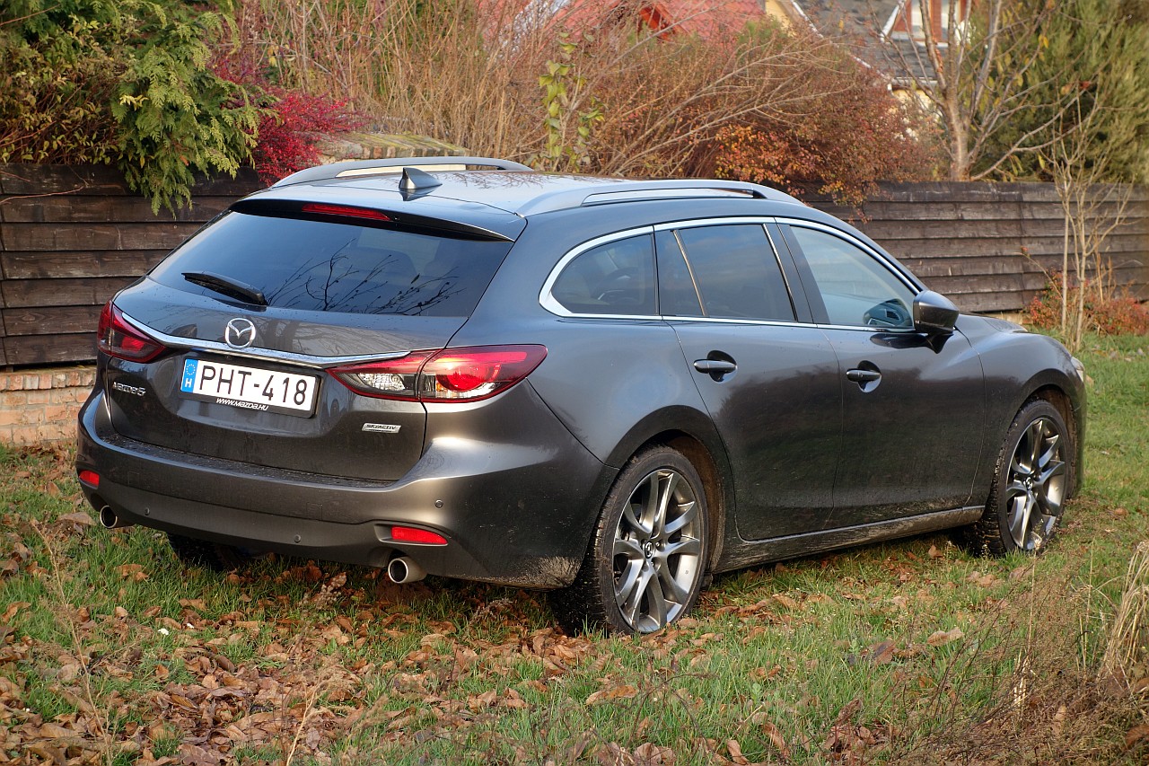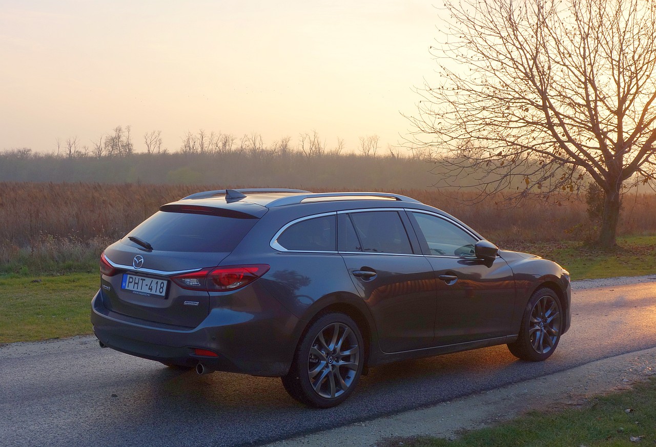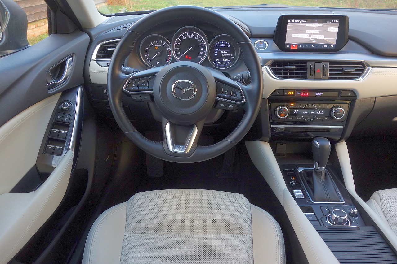 Megvannak az előnyei a márkák egységes arculatának, hiszen ennek köszönhetően ugyanúgy azonnal otthon éreztük magunkat a Mazda6-ban, mint a CX-5 vezetőülésében. Ugyanakkor nyilván már a beszállás előtt kialakul egy hangulatkép az autóról, pusztán a külső látványa alapján. E tekintetben nincs érdemi különbség a CX-5 és a Mazda6 kombi között, mert mindegyik sikeresen belopta magát a szívünkbe. Eltérés az ajtók nyitása után következik, holott mindkét tesztautó a leggazdagabb Revolution Top kivitelben érkezett hozzánk, igényes, világos bőrkárpitozással. Ám a magasabb építésű CX-5-be kényelmesebb a beszállás, mint a hagyományos személyautós Mazda6-ba. Ugyanez a csomagok ki- és bepakolására is igaz, hiszen a Mazda6 nem kap motoros csomagtérajtót – ellentétben a CX-5-tel. Ennek talán csak csomagokkal teli kezekkel érezzük hátrányát a Mazda6 esetében. Ugyanakkor a prémiumvásárlók részéről elvárás lehet a motoros ötödik ajtó, így inkább ezért valószínűsíthető, hogy a következő megújulással ezt is megkapja a Mazda6. Cserében viszont legalább belső csomagtérajtó-lehúzó található mindkét oldalon, ami a japán autóknál egyáltalán nem magától értetődő.