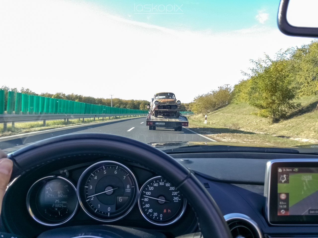 Az út során a kesztyűtartóból két darabban került elő az oda még egyben érkező napszemüvegem (az autó biztosan nem tehet róla, megnéztem, nem növesztett gonosz kezet a kesztyűtartóba). Közvetlenül ezután pedig ijesztő közelségbe kerültünk ahhoz, hogy érintőre vegyük azt a rafináltan épp szélvédőmagasságban hasító madarat, ami egy pillanatig sem tűnt barátságos méretűnek.