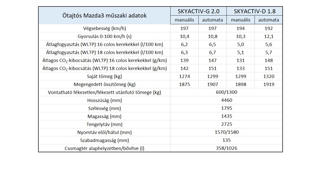 A műszaki adatokat böngészve jól látható például, hogy azonos tengelytáv mellett, a négyajtós Mazda3 húsz centiméterrel hosszabb a korántsem rövid – közel 4,5 méteres – ötajtósnál. Egyéb tekintetben nincs érdemi különbség közöttük, kivéve a szedán majd’ száz literrel nagyobb csomagterét. Érdekes viszont látni, hogy a nagyobb, 18 colos kerekeken gördülő Mazda3 modellek akár két deciliterrel több üzemanyagot igényelhetnek száz kilométerenként, mint 16 colos kerekű társaik. A fogyasztási adatok egyébként azért tűnhetnek soknak, mert azok már a WLTP szerinti értékek. Kevésbé lényeges, hogy végsebesség tekintetében a dögös ötajtós minden változatában minimálisan lemarad a négyajtóstól.