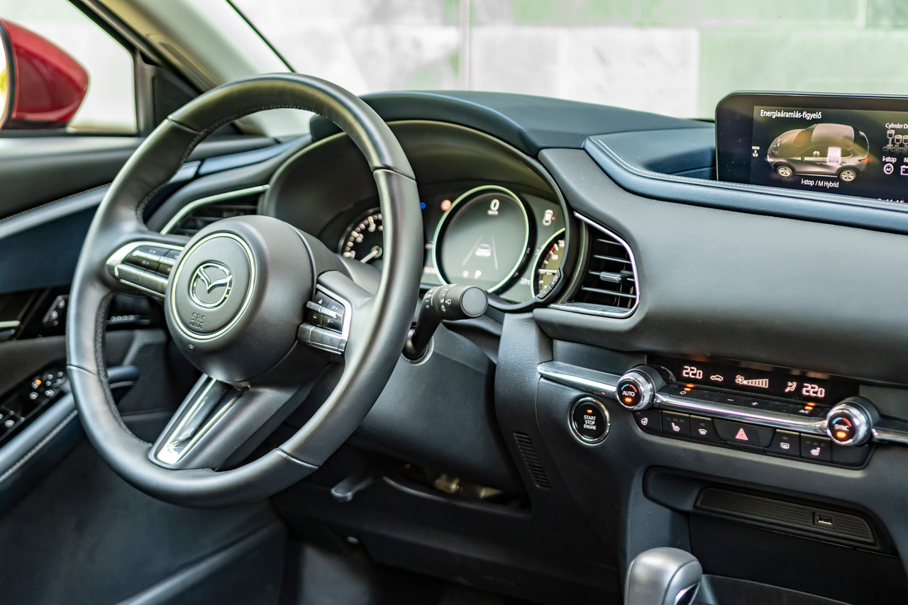 Éppen ezért volt több szempontból is érdekes legutóbbi tesztautónk, a CX-30 150 lóerős motorral és automatikus váltóval szerelt, összkerékhajtású kivitele. Nóvum volt, mert a CX-30 eddig csak a gyengébb Skyactiv motorral, kézi váltóval és elsőkerék-hajtással járt nálunk. Na persze az AWD-rendszertől sem lett terepjáró a kompakt crossoverből. Tisztázzuk is gyorsan, sem nagyobb hasmagasság, sem más terepszögek nincsenek. Egyszerűbb földutakon eddig is jól boldogult, sárba küldeni pedig az emberek nagy többségének amúgy sem lenne szíve. A futómű aszfaltozott utakra hangolt inkább, így minden kanyarban jól teljesít, a nagyobb úthibákat, vagy ha úgy tetszik a terepet már nehezebben kultiválja. A négykerékhajtás leginkább télen segíthet a meredek utcákban lakóknak, az átlagos mindennapok során szinte egyáltalán nem érezni a hatását.