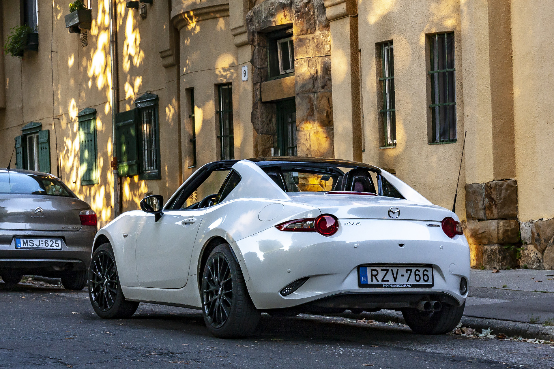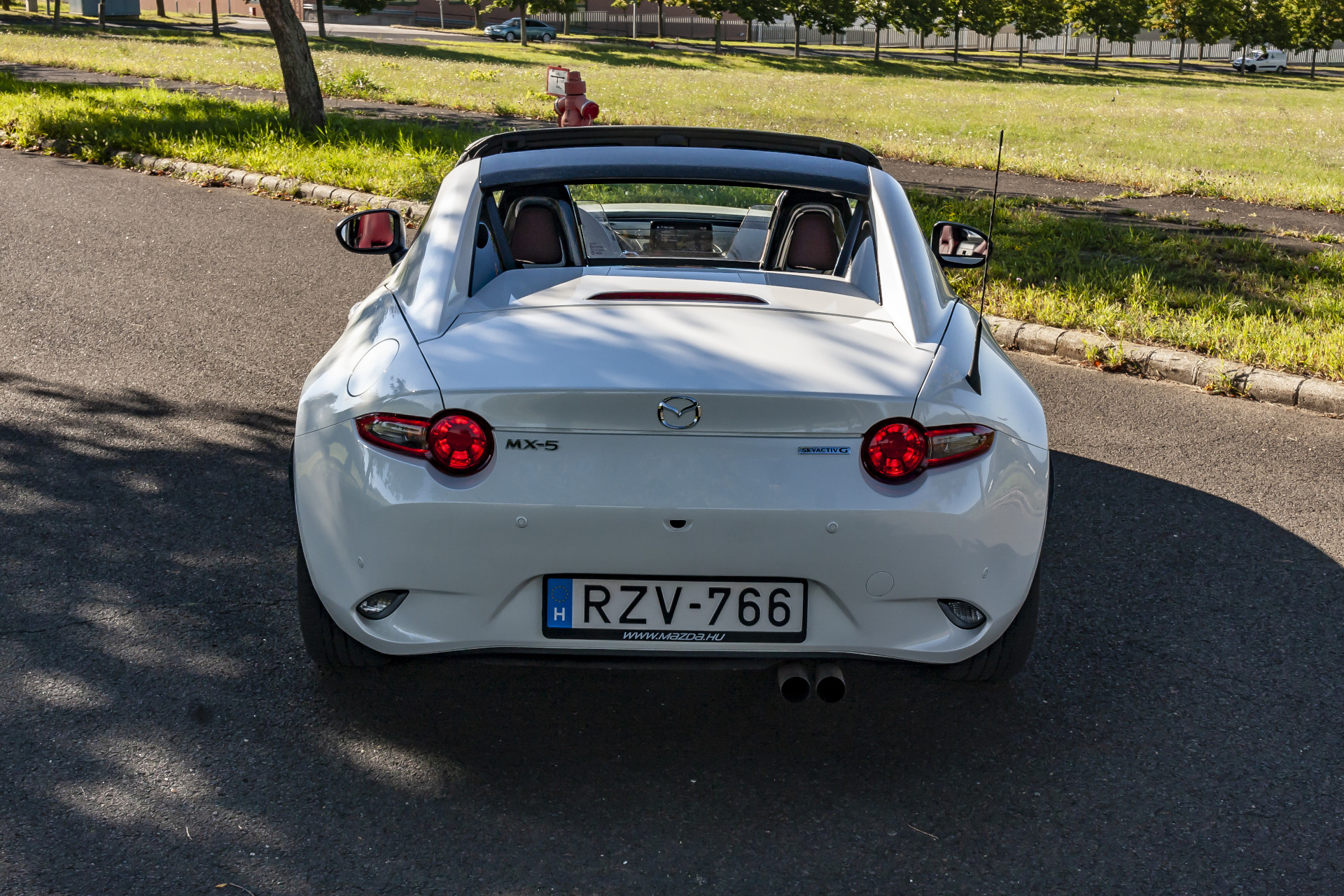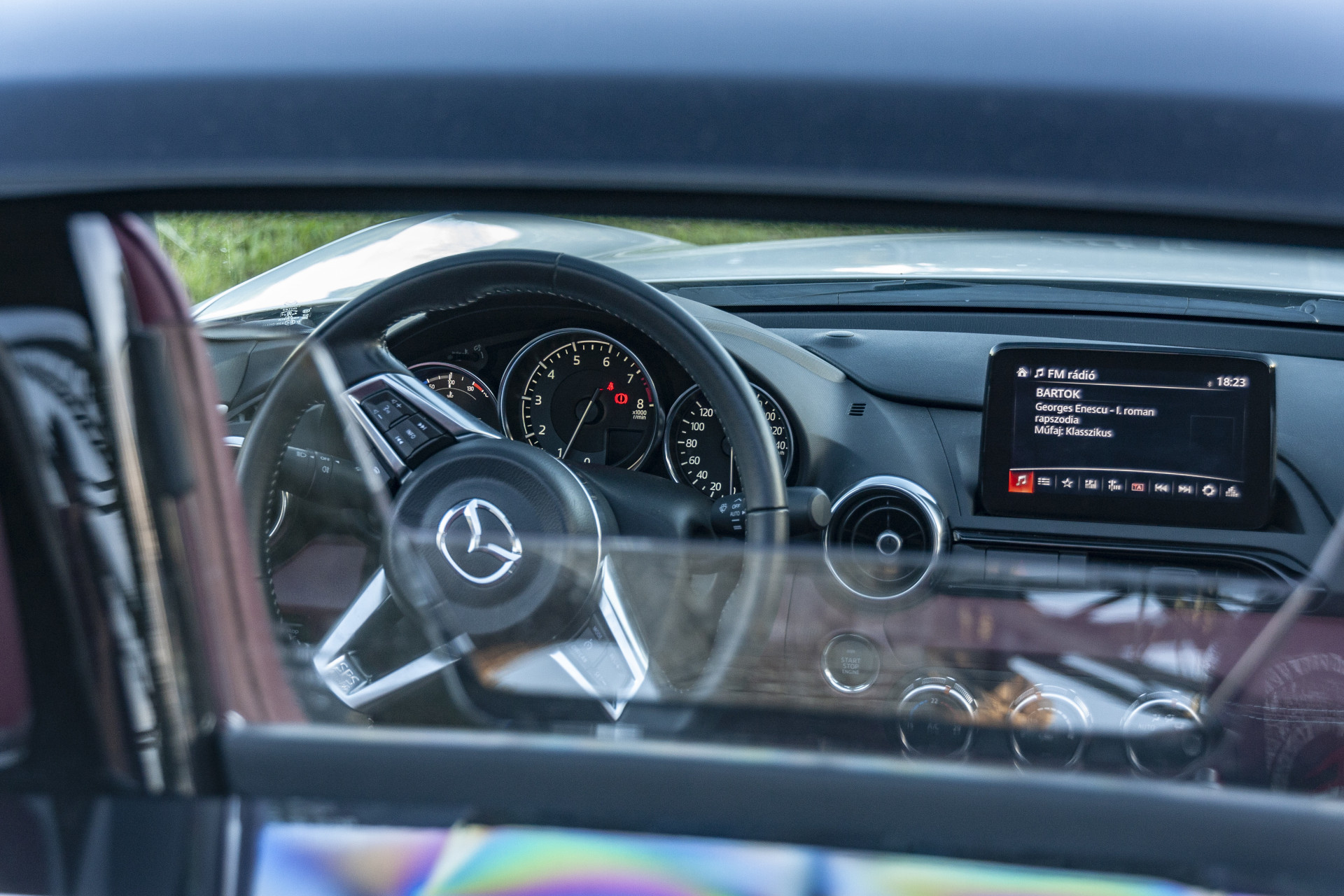 A negyventekercses autó. Ne a Tesla-tekercsekre gondoljatok, egyszerűen ennyi prémium minőségű WC-papír fér be a csomagtartóba kényelmesen, ha még két üveg bort is haza szeretnénk vinni. Jó tudni, hogy a 127 literes csomagtér térfogata legalább független a tető aktuális helyzetétől. A keménytető alig 13 másodperc alatt nyit vagy zár, ez dicséretesen fürge. Azonban pont hozzá kapcsolódik az együtt töltött időszak egyetlen olyan tulajdonsága, amivel elégedetlenkedtünk. A tető ugyanis legfeljebb 10 kilométer/órás sebességig hajlandó működni, ez többször eredményezett előre nem tervezett kényszerpihenőt. Viszont nyitott tetővel még gyorsabbnak érződik a 6,8 másodperces gyorsulás! Ilyenkor hatványozottan erősebb ingerek bombázzák érzékeinket. Megnyugtató, hogy az MX-5 még ilyenkor sem megterhelő a pénztárcánk számára. Hiszen úgy jött ki 7,0 literes átlagfogyasztás, hogy a legkevésbé sem figyeltünk rá, egyszerűen átadtuk magunkat az élvezeteknek és kihasználtuk a kis Mazda képességeit. Kicsit takarékosabb cipővel 6-6,5 literes értékek is könnyedén megvalósíthatók. Ehhez az étvágyhoz bőségesen elegendő a 45 literes üzemanyagtartály.