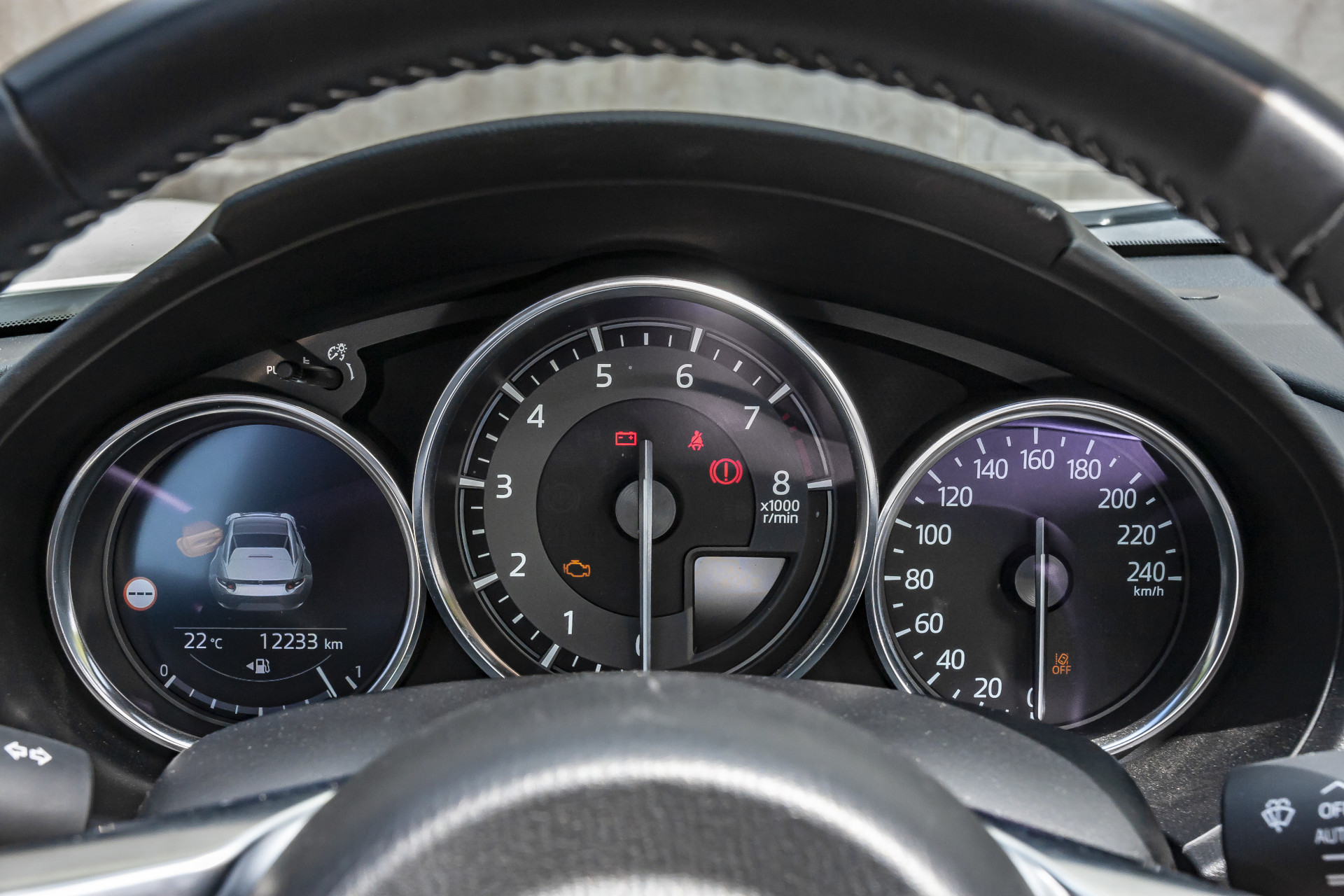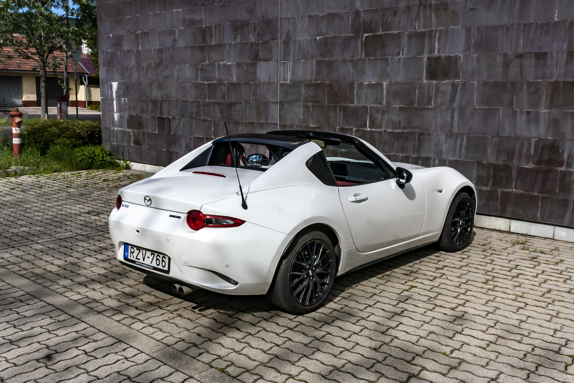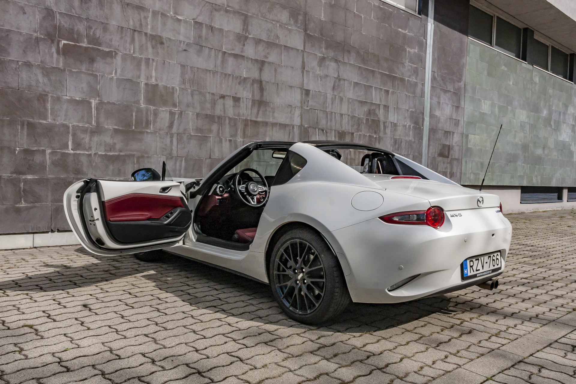 A negyventekercses autó. Ne a Tesla-tekercsekre gondoljatok, egyszerűen ennyi prémium minőségű WC-papír fér be a csomagtartóba kényelmesen, ha még két üveg bort is haza szeretnénk vinni. Jó tudni, hogy a 127 literes csomagtér térfogata legalább független a tető aktuális helyzetétől. A keménytető alig 13 másodperc alatt nyit vagy zár, ez dicséretesen fürge. Azonban pont hozzá kapcsolódik az együtt töltött időszak egyetlen olyan tulajdonsága, amivel elégedetlenkedtünk. A tető ugyanis legfeljebb 10 kilométer/órás sebességig hajlandó működni, ez többször eredményezett előre nem tervezett kényszerpihenőt. Viszont nyitott tetővel még gyorsabbnak érződik a 6,8 másodperces gyorsulás! Ilyenkor hatványozottan erősebb ingerek bombázzák érzékeinket. Megnyugtató, hogy az MX-5 még ilyenkor sem megterhelő a pénztárcánk számára. Hiszen úgy jött ki 7,0 literes átlagfogyasztás, hogy a legkevésbé sem figyeltünk rá, egyszerűen átadtuk magunkat az élvezeteknek és kihasználtuk a kis Mazda képességeit. Kicsit takarékosabb cipővel 6-6,5 literes értékek is könnyedén megvalósíthatók. Ehhez az étvágyhoz bőségesen elegendő a 45 literes üzemanyagtartály.